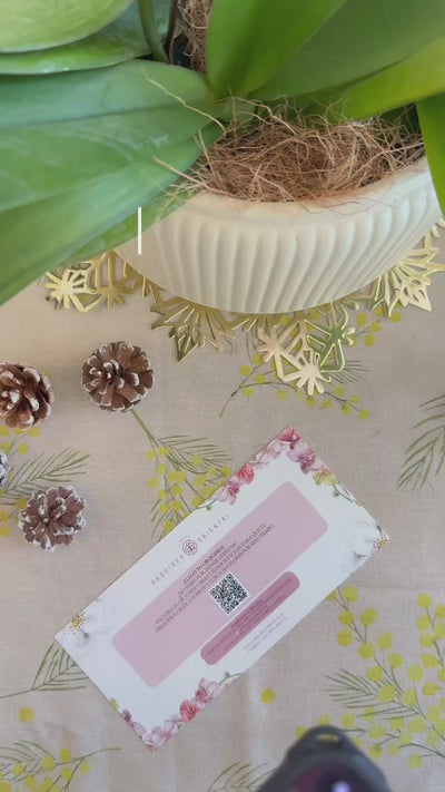 Incluye una orquidea grande, abonos de crecimiento, floracion, una bolsa de sustrato chips de coco todo dentro de una bolsa preciosa con cinta decorativa, tarjeta de cuidados y por por navidad va con un calendario.