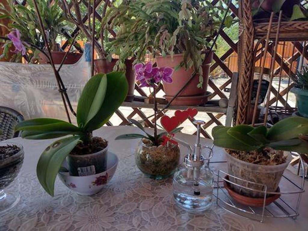 Cuando ya necesite riego, pon una taza de café (aproximadamente 200 ml de agua) por planta directamente en sus raíces ,si tienes un arreglo de 7 orquídeas sería 7 tazas, de 200 cc una, por cada planta (si tienes agua filtrada mejor regar con esa).