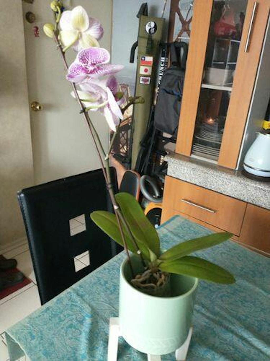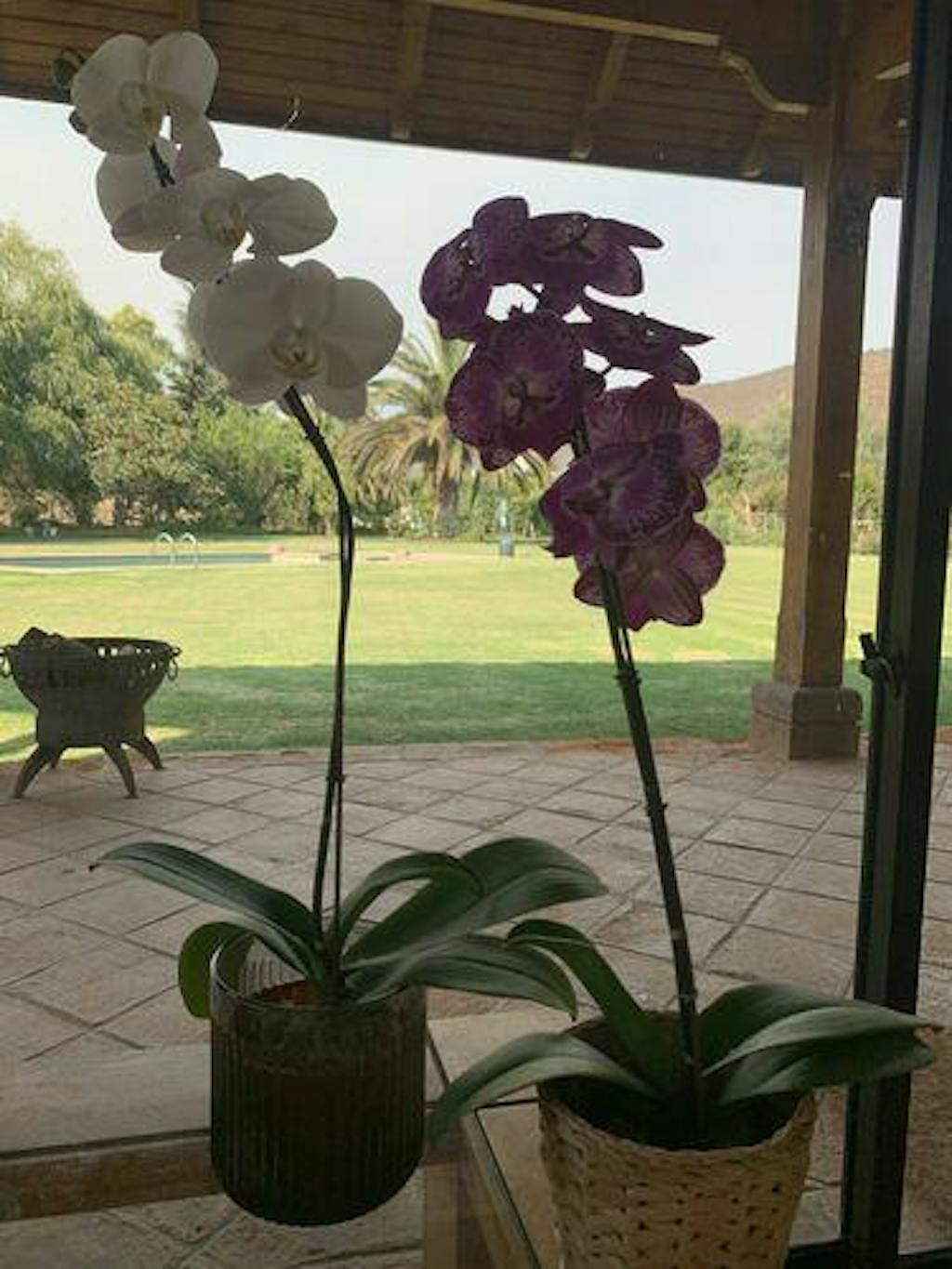 Cuando ya necesite riego, pon una taza de café (aproximadamente 200 ml de agua) por planta directamente en sus raíces ,si tienes un arreglo de 7 orquídeas sería 7 tazas, de 200 cc una, por cada planta (si tienes agua filtrada mejor regar con esa).